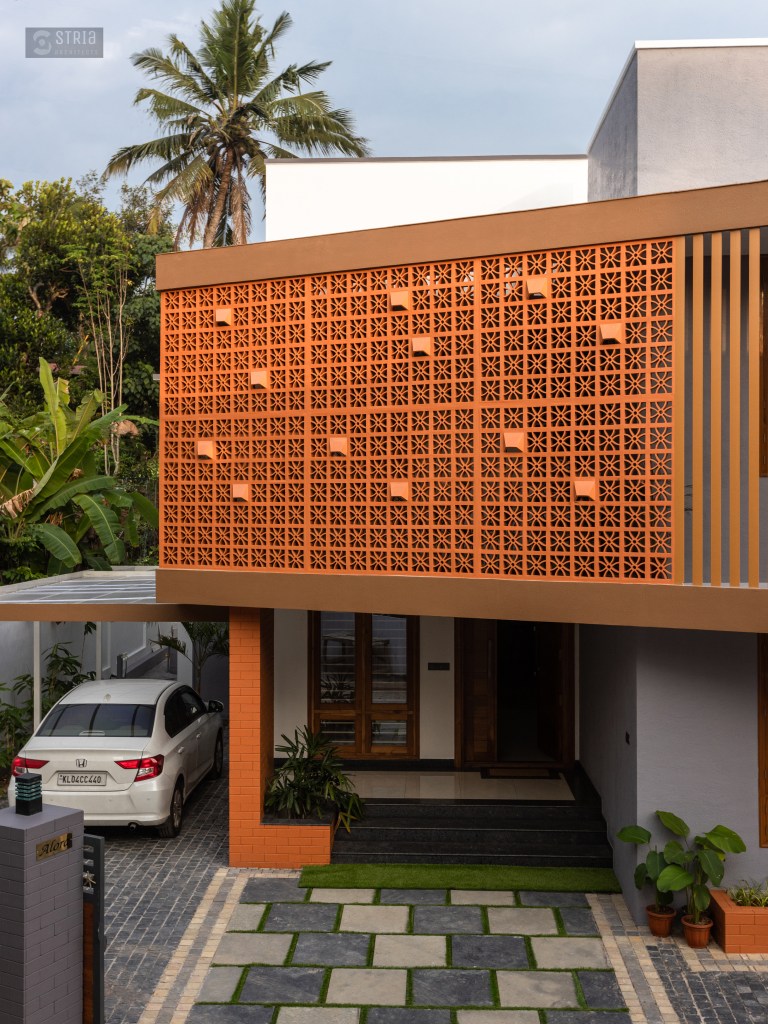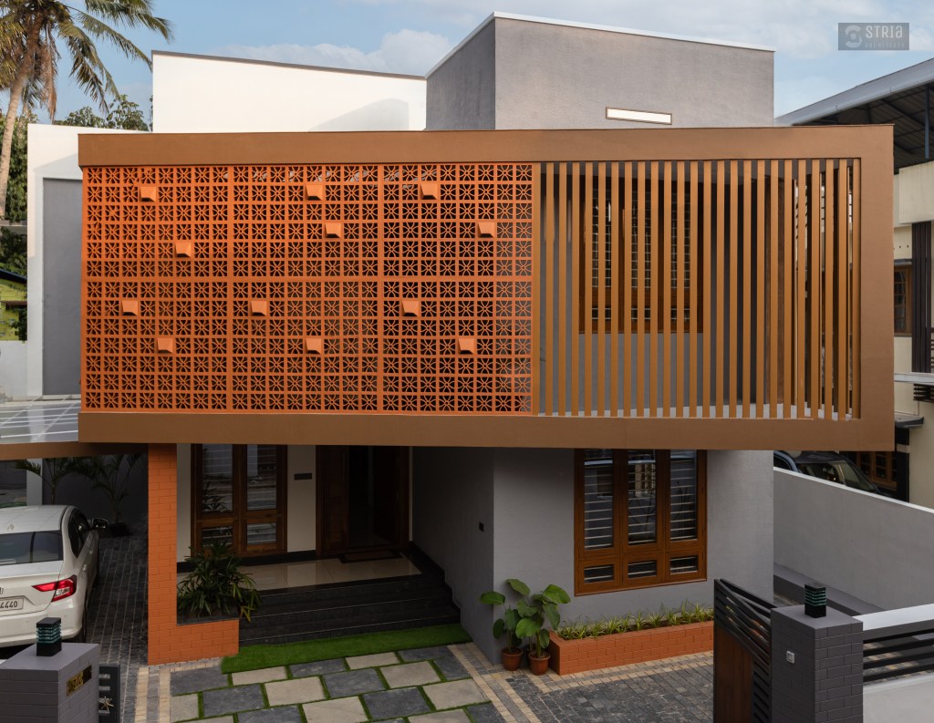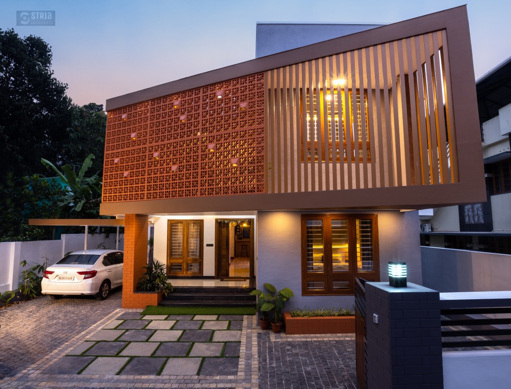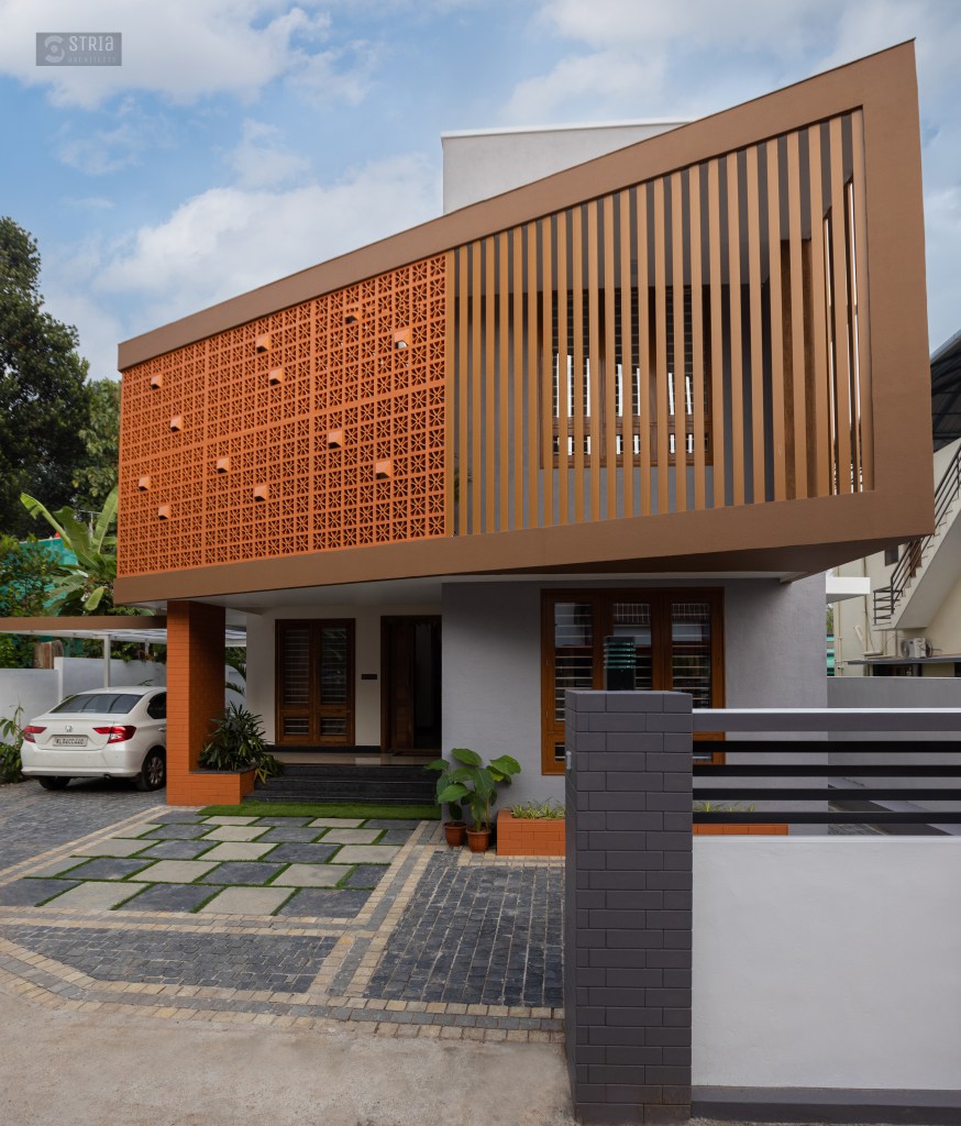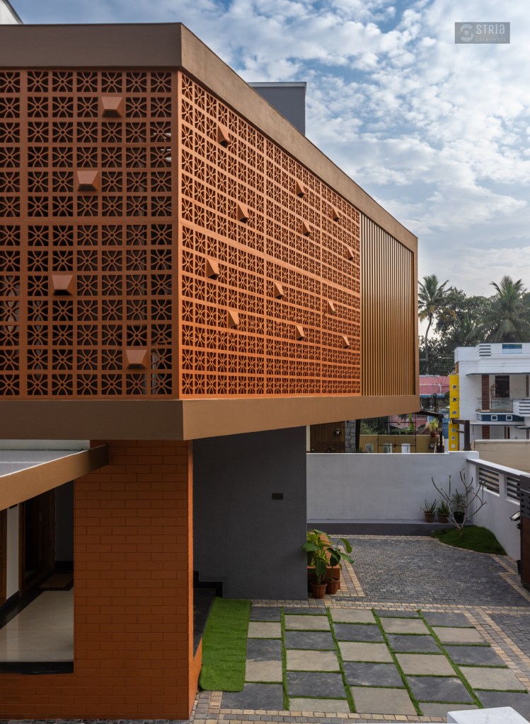 Project Description – Located in the heart of Trivandrum, near Kundamankadavu bridge, the project translates the intention of the family to create a real « family cocoon », where the functional and hearty space is open to the outside, giving rise to diffuse natural light in all the common rooms. Thus, the ambition of the project is to bring conviviality, warmth, and light but also a playful touch to this young family house. A central staircase coupled with the double height and its glazed openings , it becomes a truly playful and dynamic space for the family. Moreover, the interior of the house is punctuated with touches of this same tonality. Also, the second level dramatizes the architectural and formal expression of the front facade.