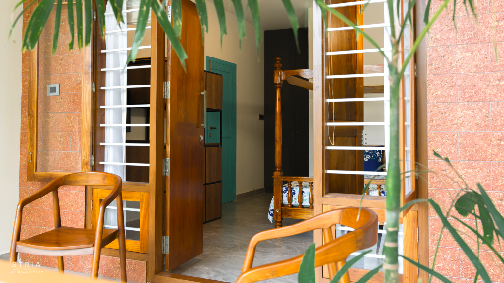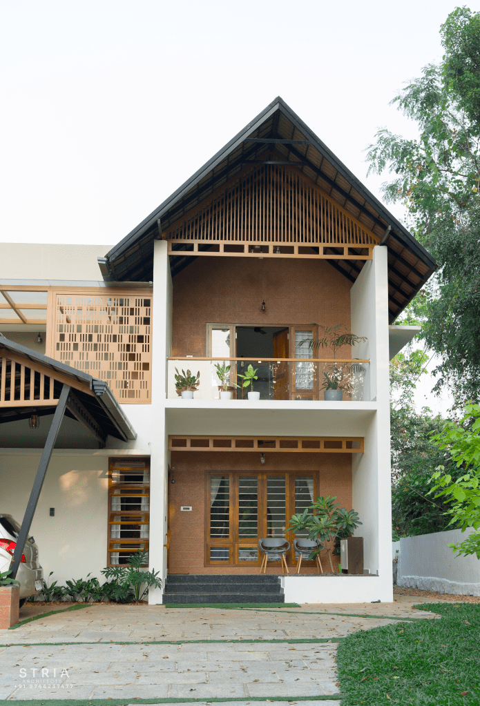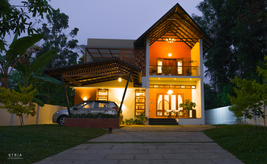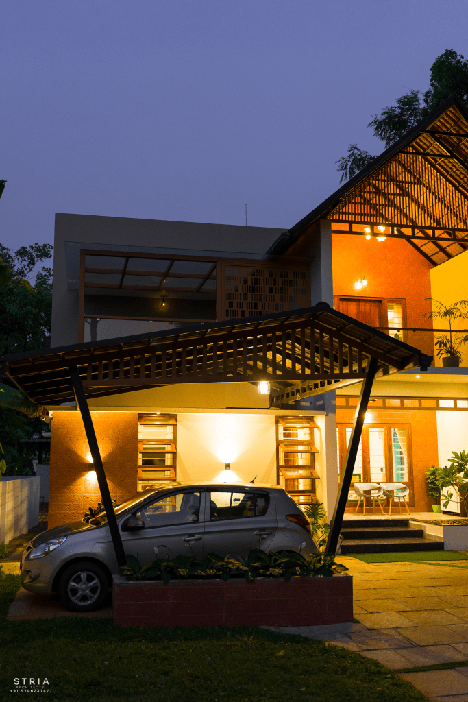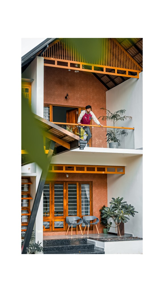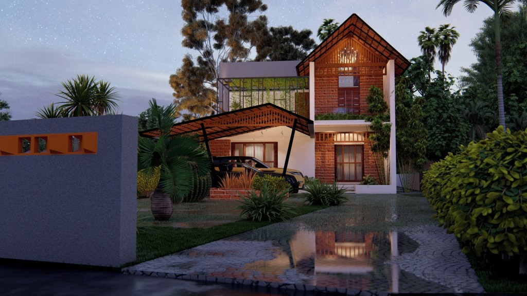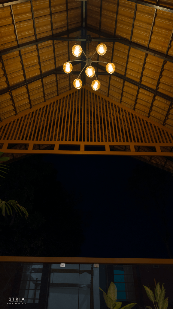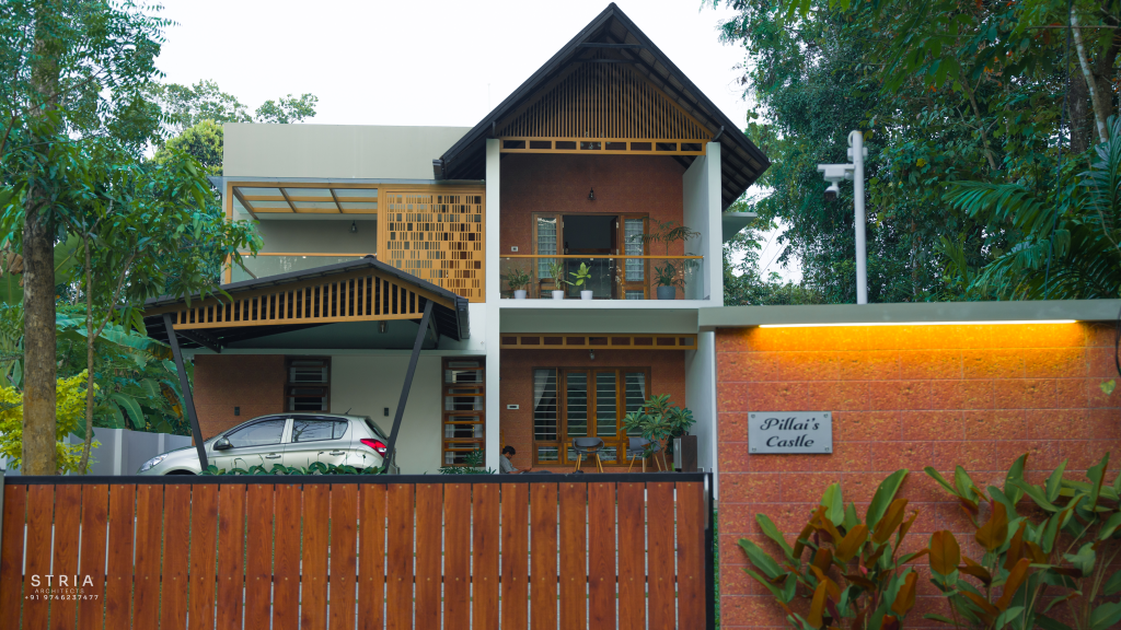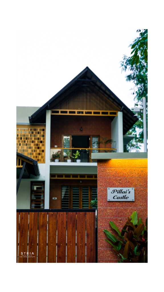 Project Description – The architectural design of Pillai’s castle in the outskirts of Pathanamthitta seamlessly blends traditional elements with contemporary aesthetics. The traditional sloping roof adds a timeless charm while incorporating modern design elements. The inclusion of a courtyard within the house enhances the connection with nature and provides a tranquil space for relaxation. The use of a variety of colors for doors and windows, along with diverse patterns in floor tiles, adds vibrancy and character to the interior spaces. The spacious open-concept design ensures fluidity and functionality, allowing for easy movement and interaction between different areas of the house. Furthermore, prioritizing maximum ventilation and natural light not only enhances the overall comfort of the living spaces but also promotes a healthier and more sustainable living environment. This emphasis on ventilation and natural light creates a sense of openness and brings the lush green surroundings indoors, blurring the boundaries between the interior and exterior spaces.