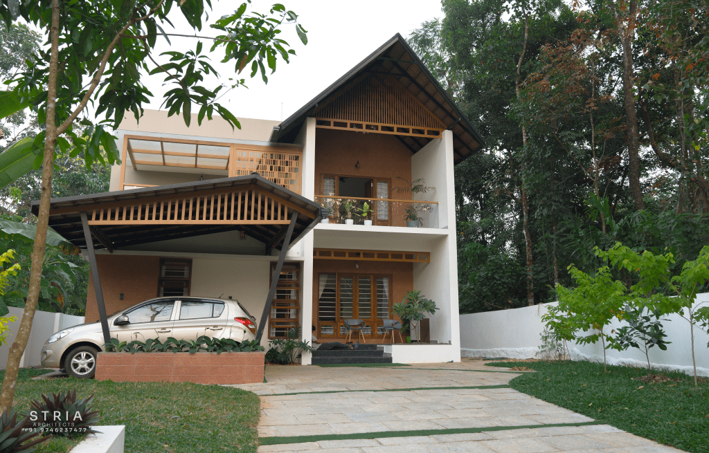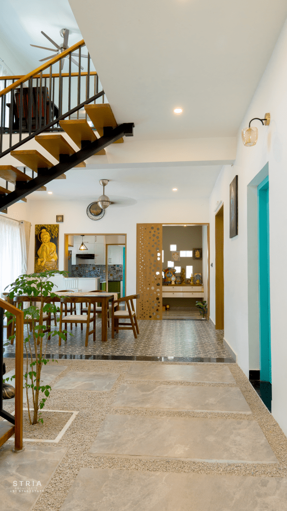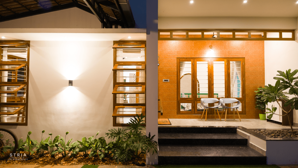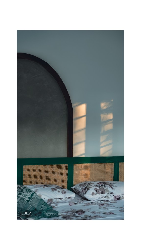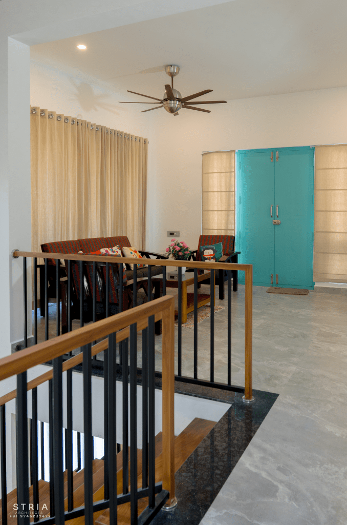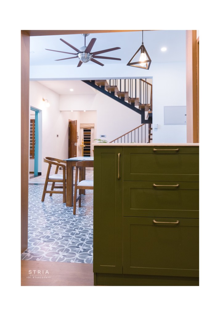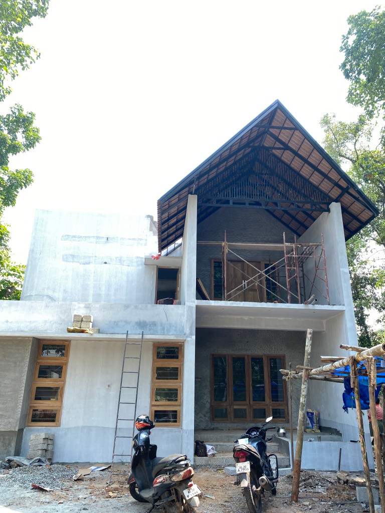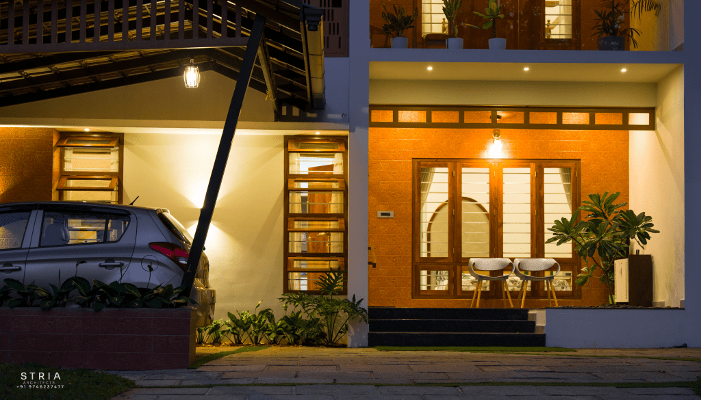 Project Description – The architectural design of Pillai’s castle in the outskirts of Pathanamthitta seamlessly blends traditional elements with contemporary aesthetics. The traditional sloping roof adds a timeless charm while incorporating modern design elements. The inclusion of a courtyard within the house enhances the connection with nature and provides a tranquil space for relaxation. The use of a variety of colors for doors and windows, along with diverse patterns in floor tiles, adds vibrancy and character to the interior spaces. The spacious open-concept design ensures fluidity and functionality, allowing for easy movement and interaction between different areas of the house. Furthermore, prioritizing maximum ventilation and natural light not only enhances the overall comfort of the living spaces but also promotes a healthier and more sustainable living environment. This emphasis on ventilation and natural light creates a sense of openness and brings the lush green surroundings indoors, blurring the boundaries between the interior and exterior spaces.
