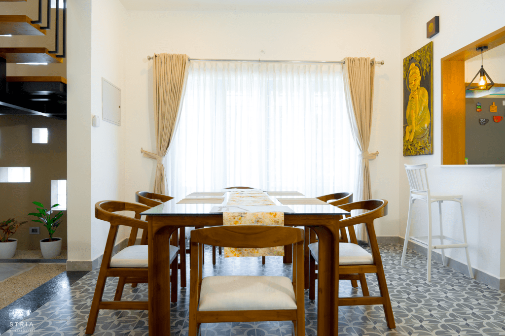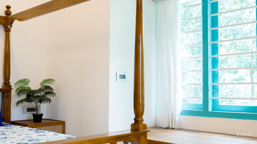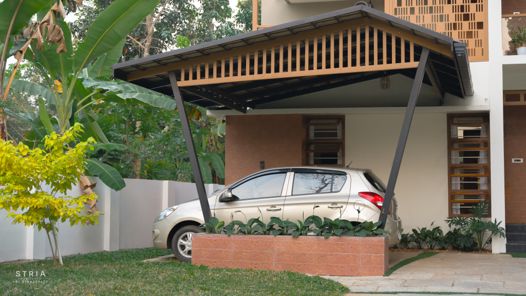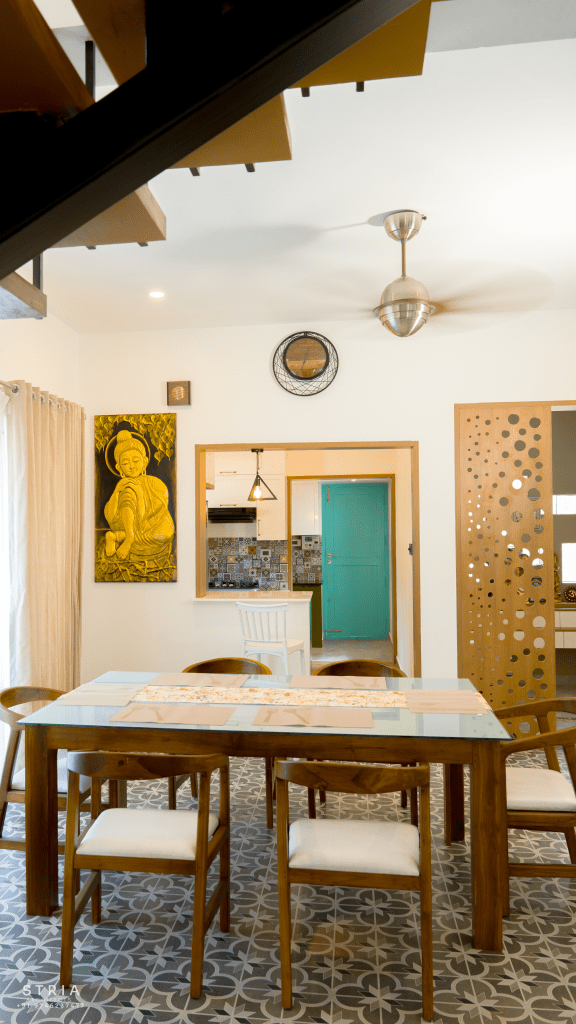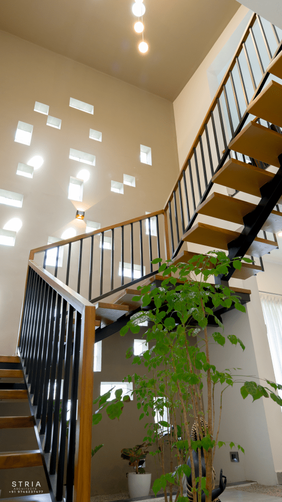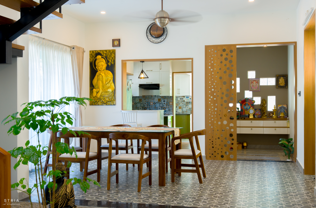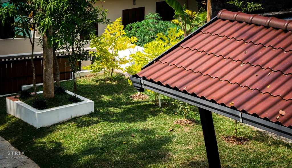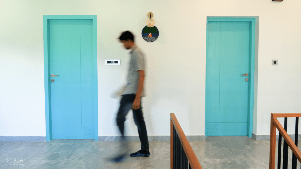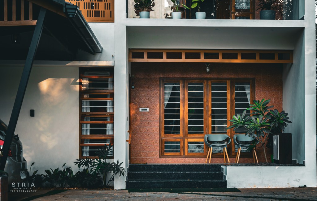 Project Description – The architectural design of Pillai’s castle in the outskirts of Pathanamthitta seamlessly blends traditional elements with contemporary aesthetics. The traditional sloping roof adds a timeless charm while incorporating modern design elements. The inclusion of a courtyard within the house enhances the connection with nature and provides a tranquil space for relaxation. The use of a variety of colors for doors and windows, along with diverse patterns in floor tiles, adds vibrancy and character to the interior spaces. The spacious open-concept design ensures fluidity and functionality, allowing for easy movement and interaction between different areas of the house. Furthermore, prioritizing maximum ventilation and natural light not only enhances the overall comfort of the living spaces but also promotes a healthier and more sustainable living environment. This emphasis on ventilation and natural light creates a sense of openness and brings the lush green surroundings indoors, blurring the boundaries between the interior and exterior spaces.