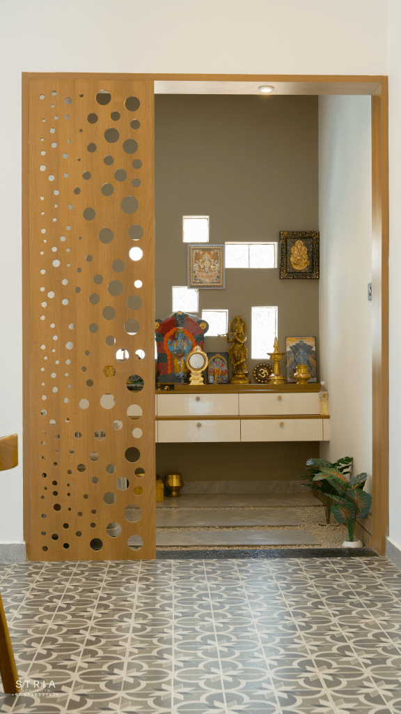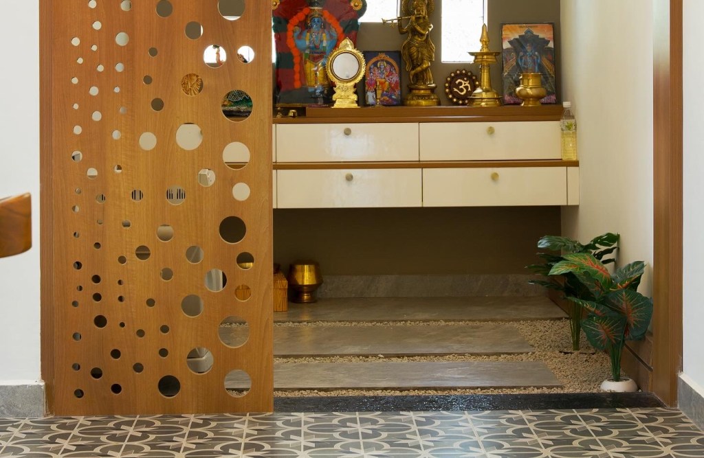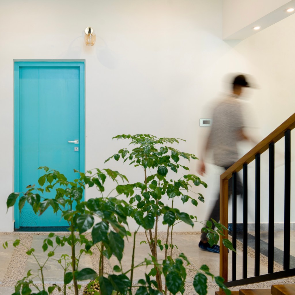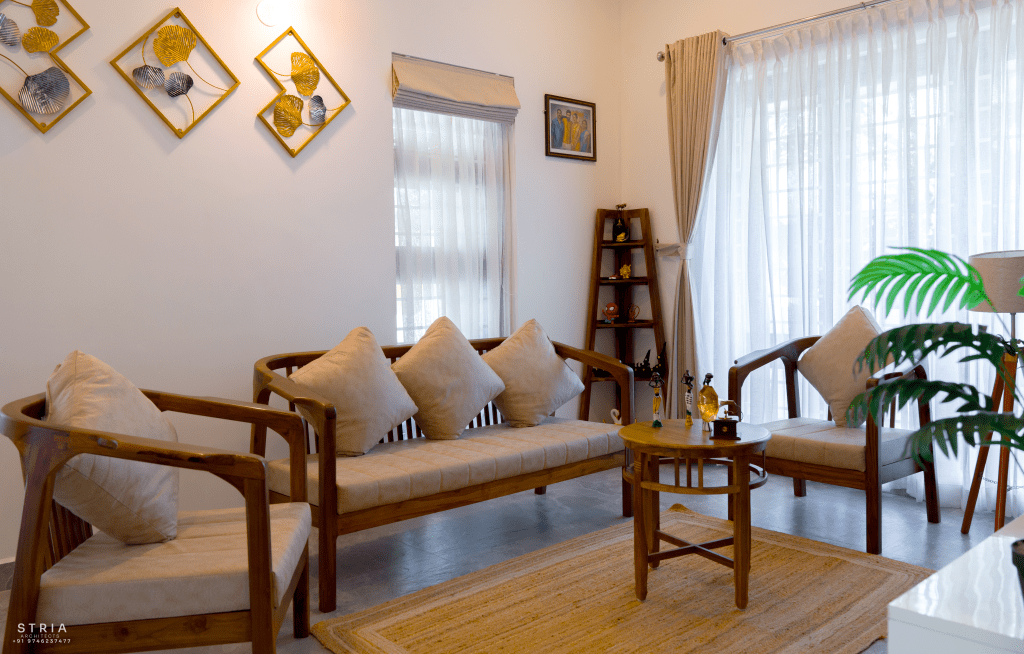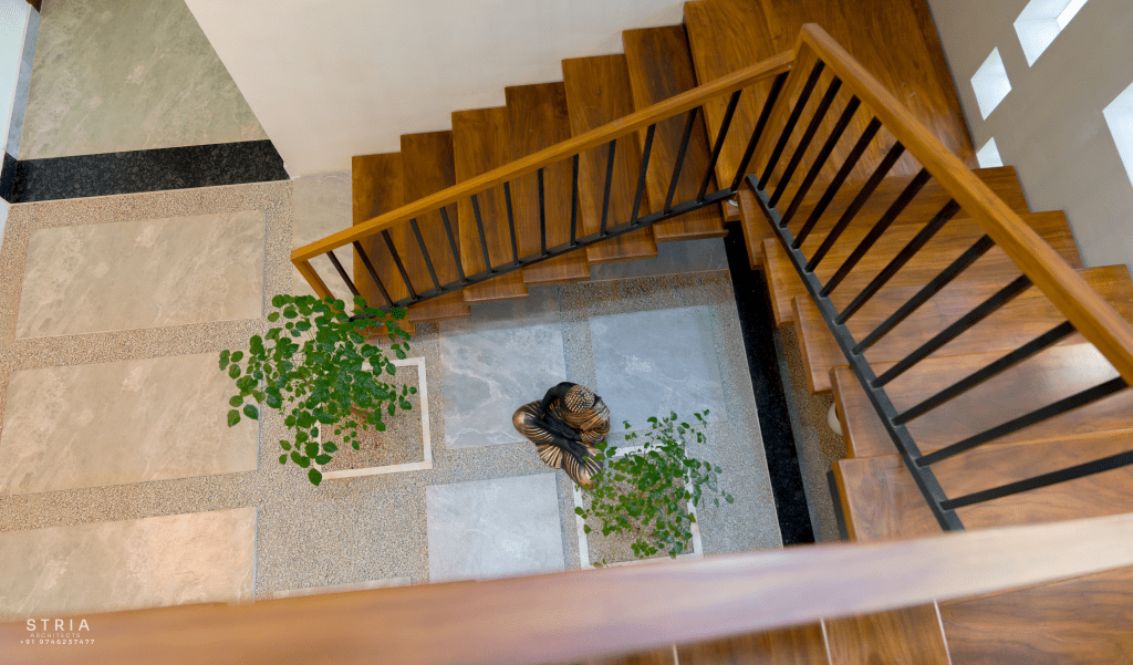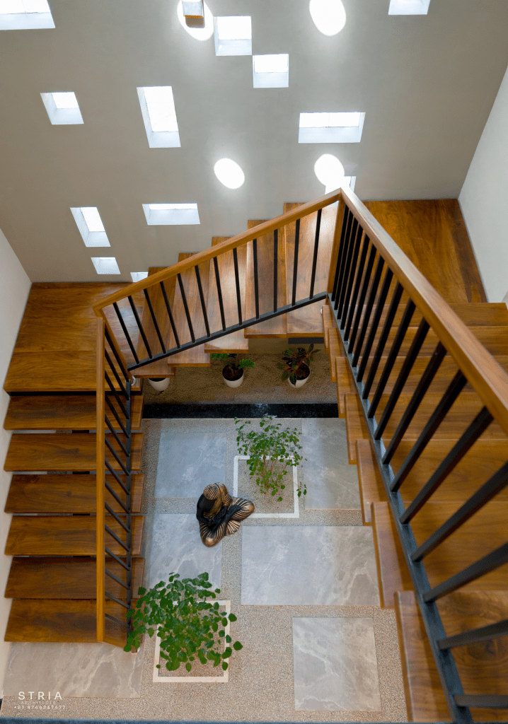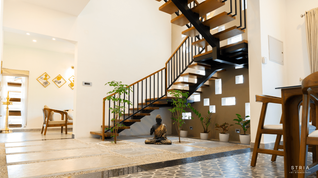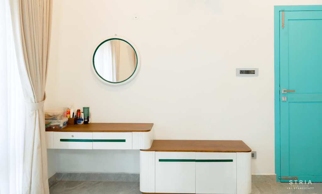 Project Description – The architectural design of Pillai’s castle in the outskirts of Pathanamthitta seamlessly blends traditional elements with contemporary aesthetics. The traditional sloping roof adds a timeless charm while incorporating modern design elements. The inclusion of a courtyard within the house enhances the connection with nature and provides a tranquil space for relaxation. The use of a variety of colors for doors and windows, along with diverse patterns in floor tiles, adds vibrancy and character to the interior spaces. The spacious open-concept design ensures fluidity and functionality, allowing for easy movement and interaction between different areas of the house. Furthermore, prioritizing maximum ventilation and natural light not only enhances the overall comfort of the living spaces but also promotes a healthier and more sustainable living environment. This emphasis on ventilation and natural light creates a sense of openness and brings the lush green surroundings indoors, blurring the boundaries between the interior and exterior spaces.