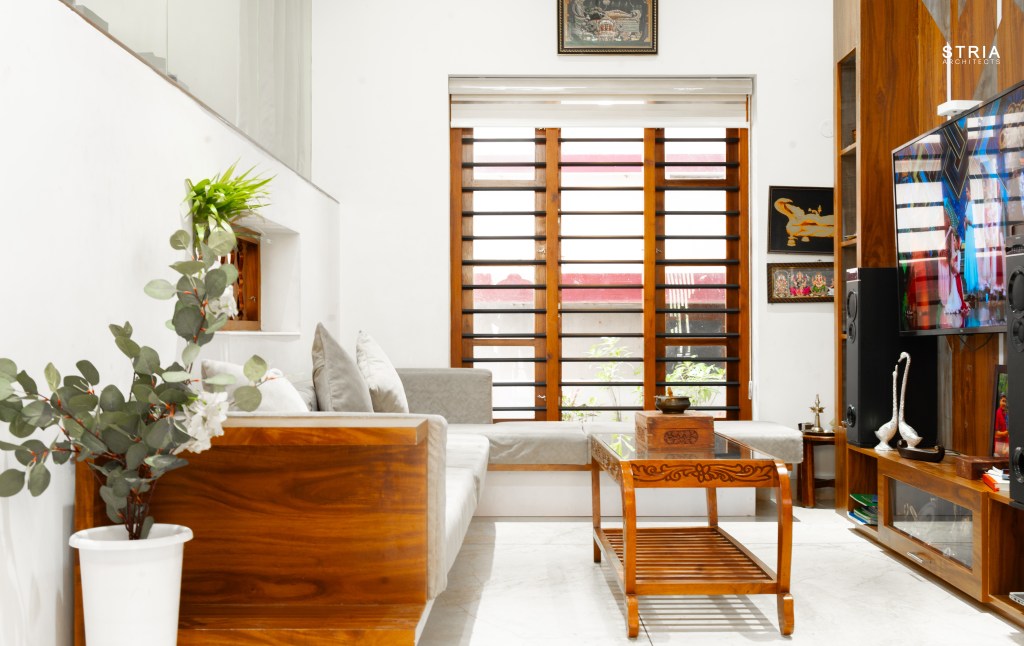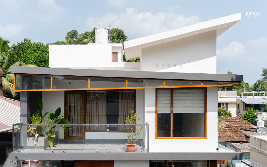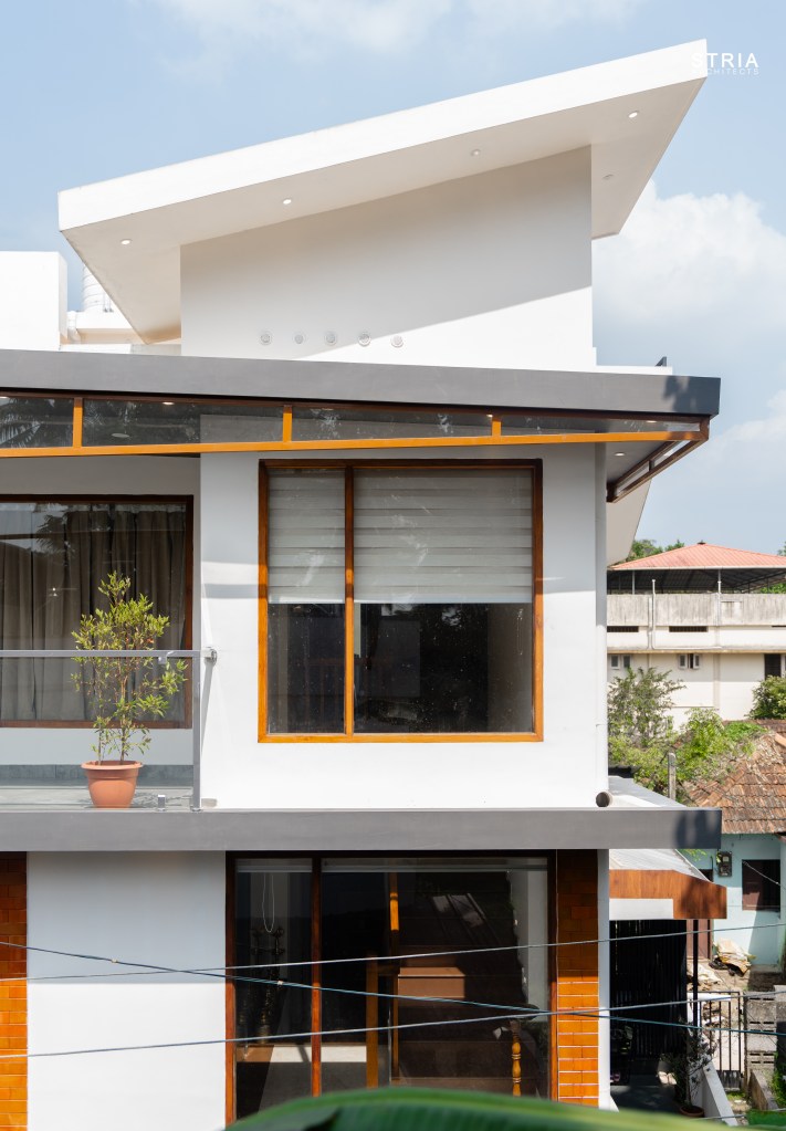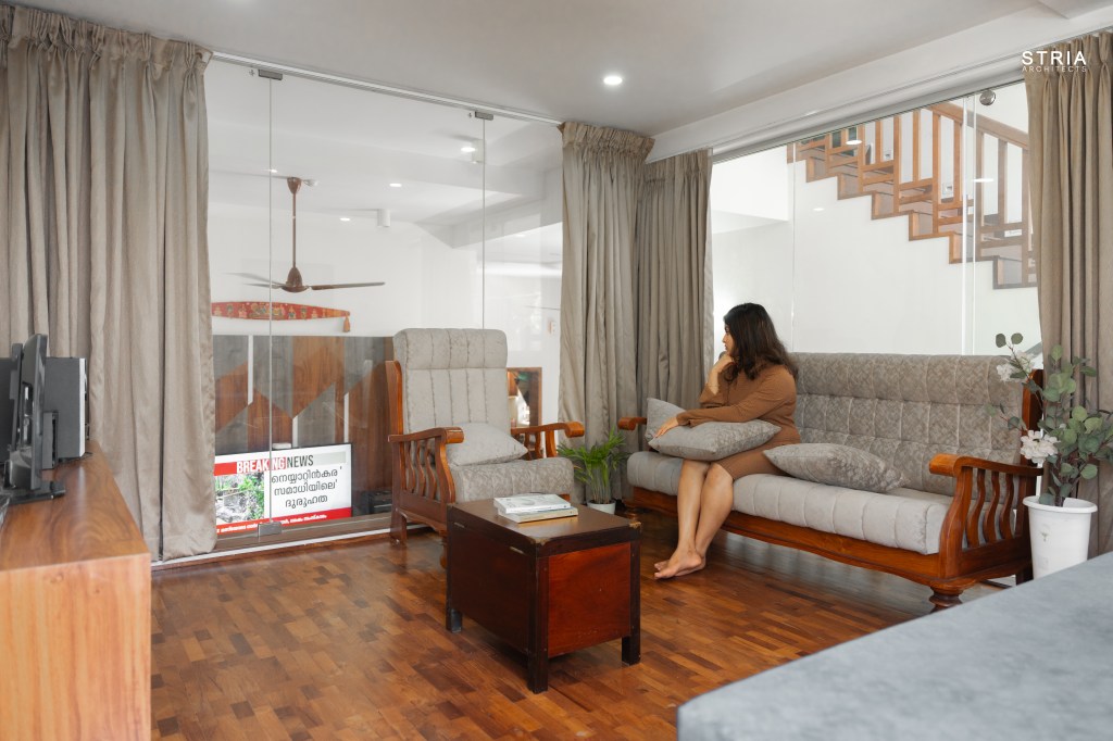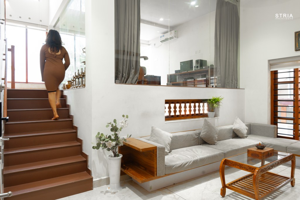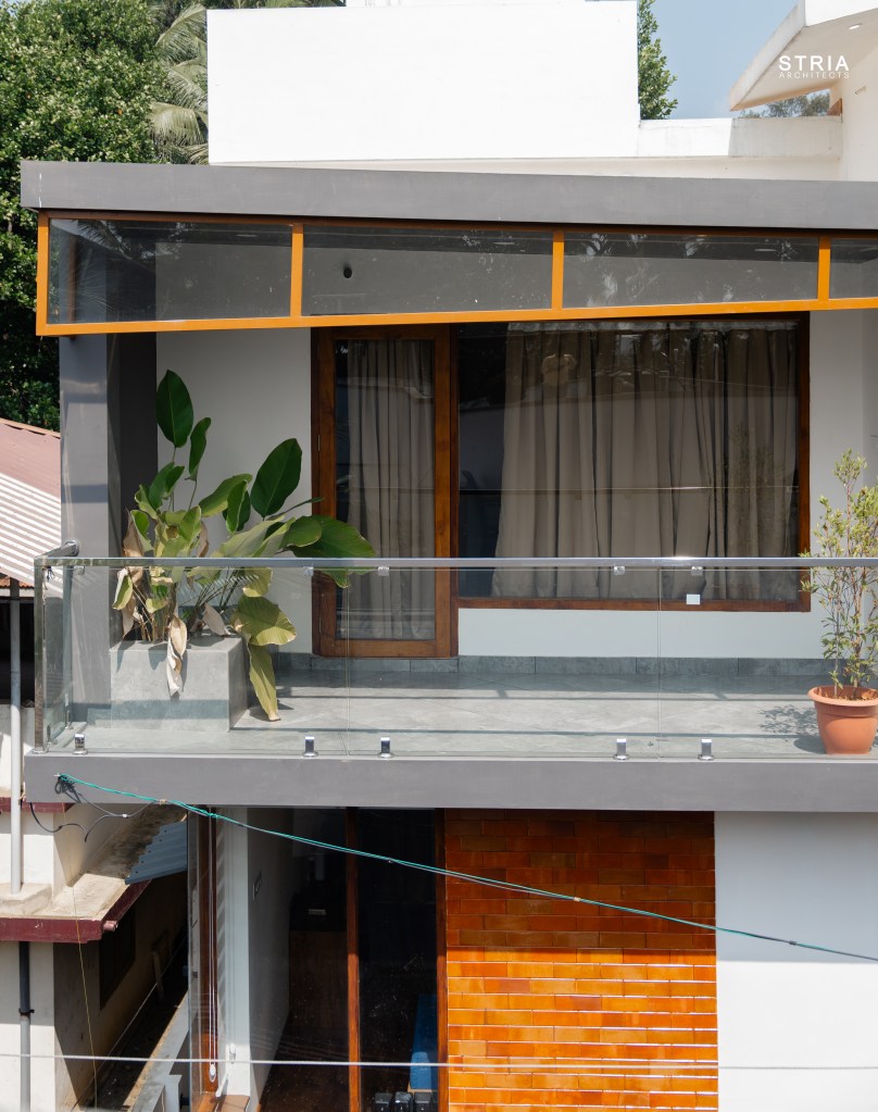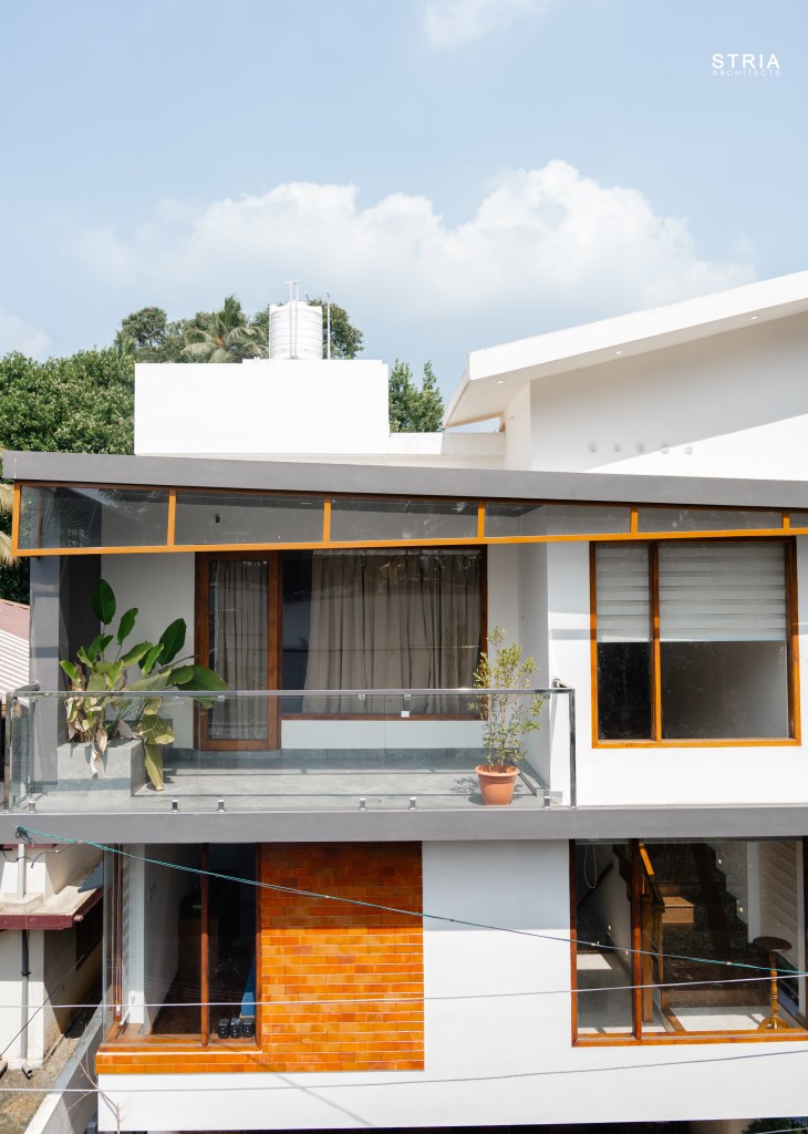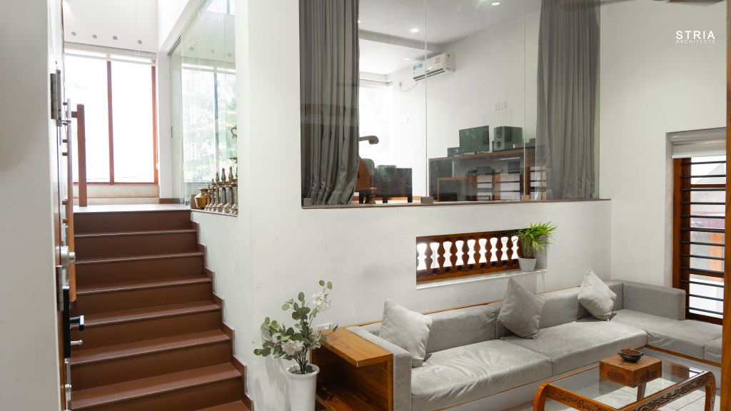 Project Description – Designed on a compact 3.5-cent plot, this 2500 sqft home defies its constraints with smart architectural elements. Featuring a mezzanine floor, 4 attached bedrooms, 2 living rooms, and large glass windows for abundant light and ventilation, the space feels open and expansive despite its narrow footprint.