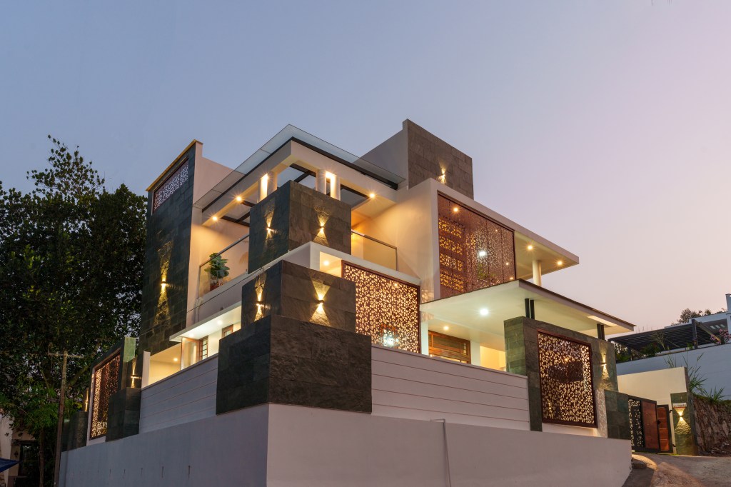 Project Description – Designing for a plot with two side roads and a relatively compact size of 5.5 cents presented both challenges and opportunities that demanded meticulous architectural consideration. Despite the constraints, we seamlessly integrated a plethora of client requirements, including a home theatre, an expansive open-concept courtyard, a cozy patio, three bedrooms, a dedicated reading space, and a charming balcony, all within the confines of a 2100 square feet built-up area.