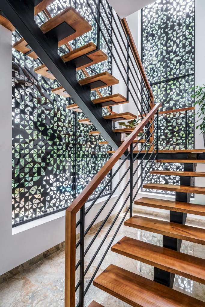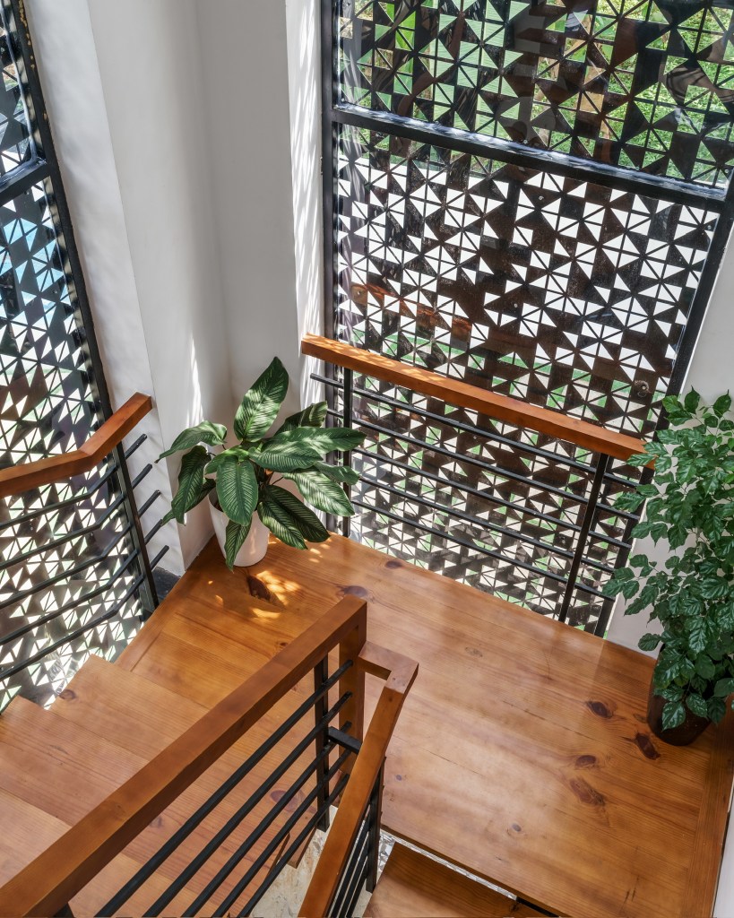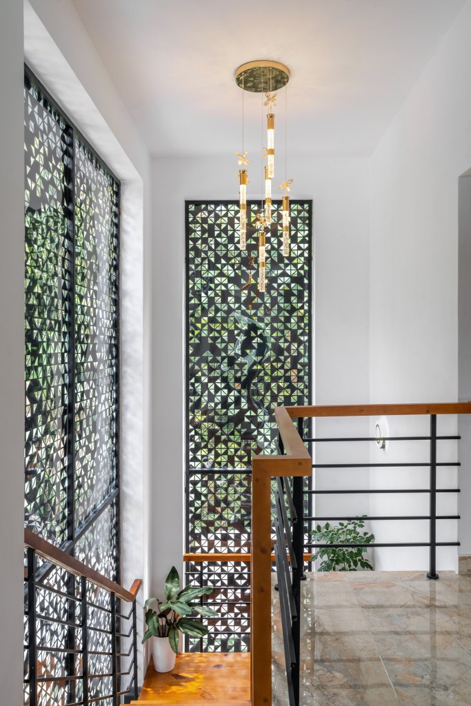 To address these challenges, the incorporation of a metal jali (lattice screen) serves multiple purposes within the design. Not only does it provide a visually striking architectural feature, but it also offers practical benefits such as privacy, security, and natural ventilation. Additionally, the inclusion of an internal courtyard further enhances the design by introducing elements of light, air, and greenery into the living spaces.
